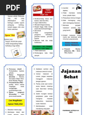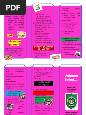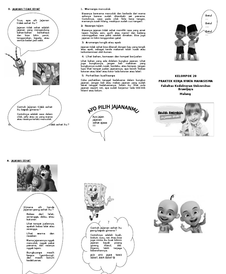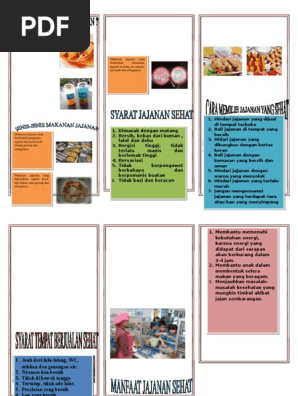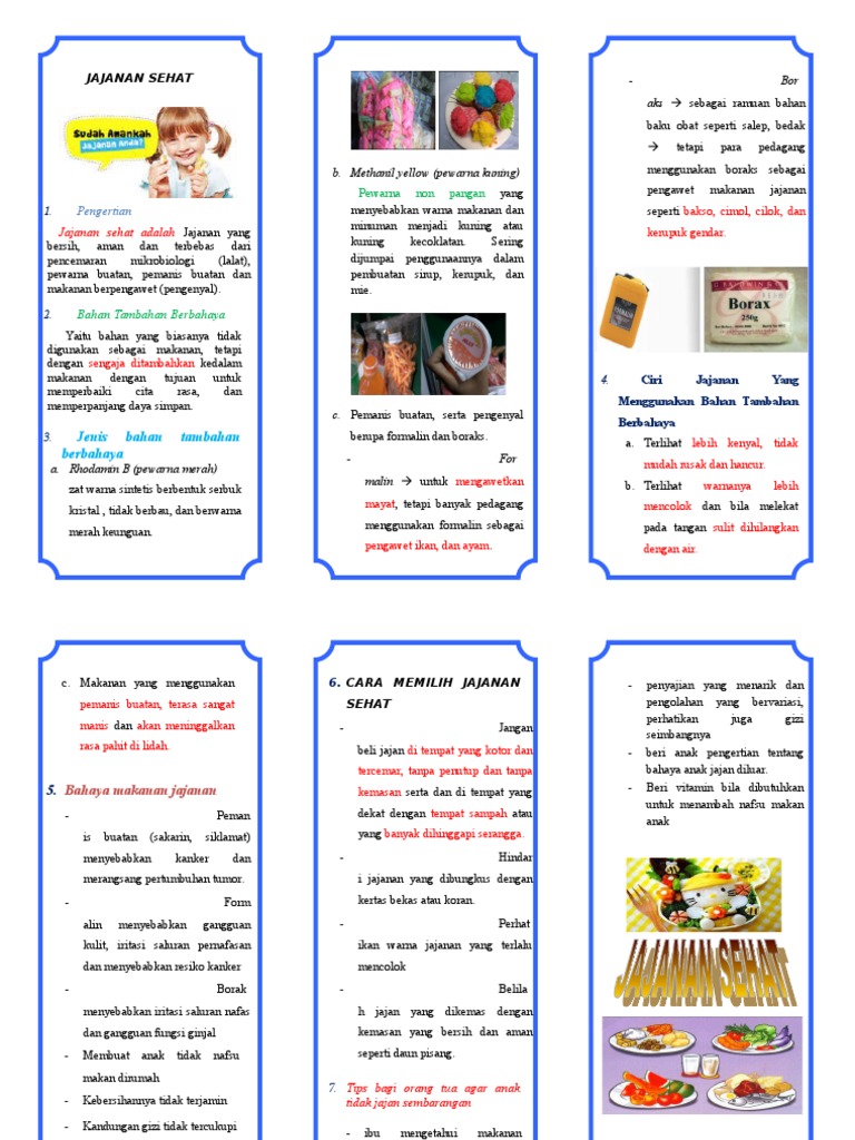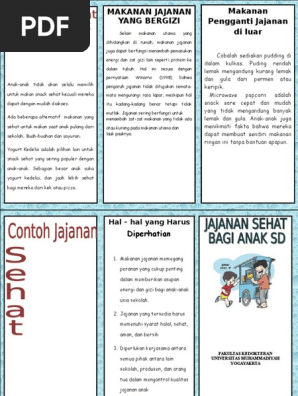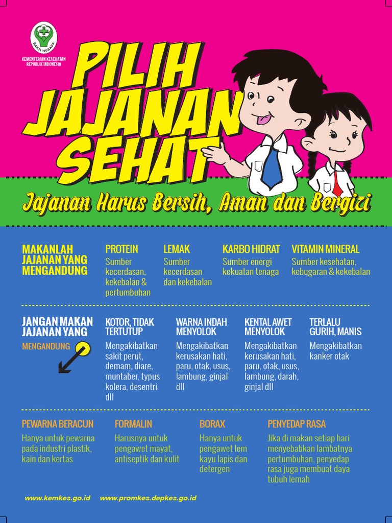 Leaflet jajanan sehat anak sekolah. Media visual poster dan leaflet makanan sehat serta perilaku konsumsi makanan jajanan siswa sekolah lanjutan atas di kabupaten mandailing natal kebutuhan energi protein dan zat besi dapat disumbangkan oleh makanan jajanan masing masing sekitar 36 29 dan 52. Lalu jajanan seperti apakah yang sehat untuk anak. Terlebih harganya pun umumnya cukup murah. Makanan sehat bagi anak merupakan suatu kewajiban jika anda menginginkan tumbuh kembang anak maksimal bukan hanya urusan kesehatan melainkan kualitas otak dipengaruhi oleh makanan sehat.